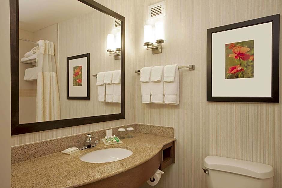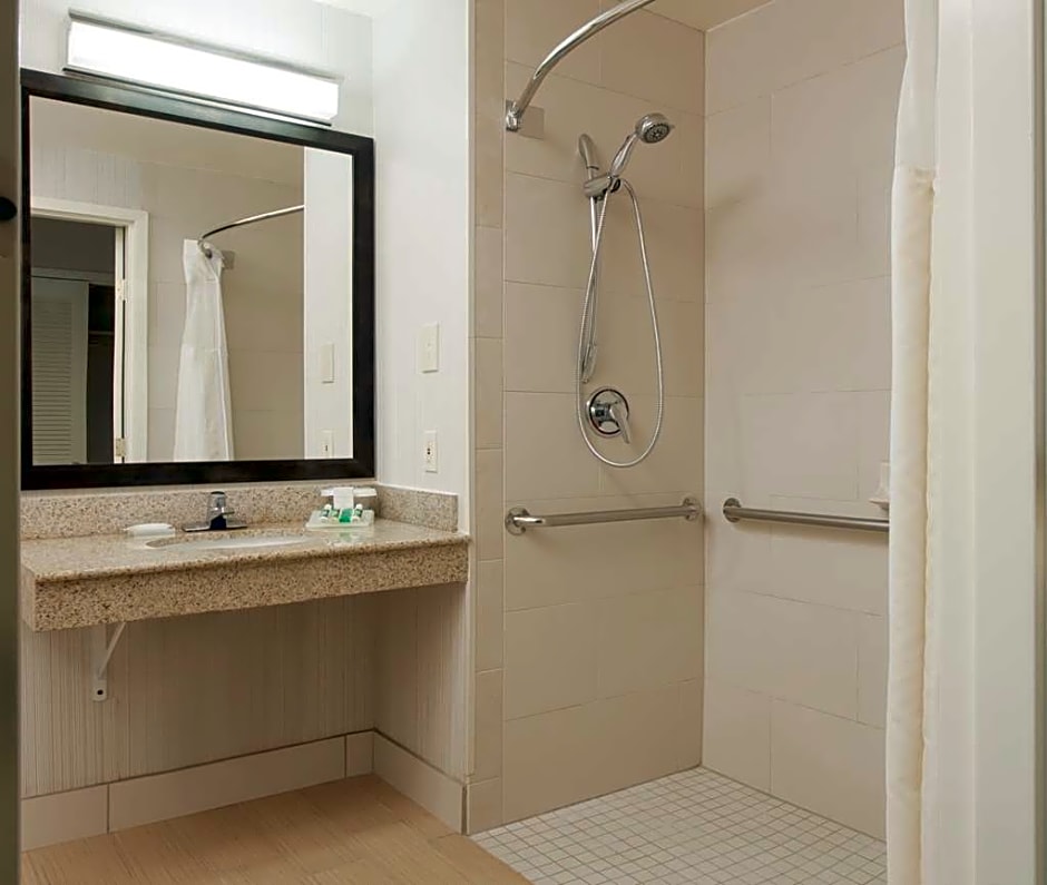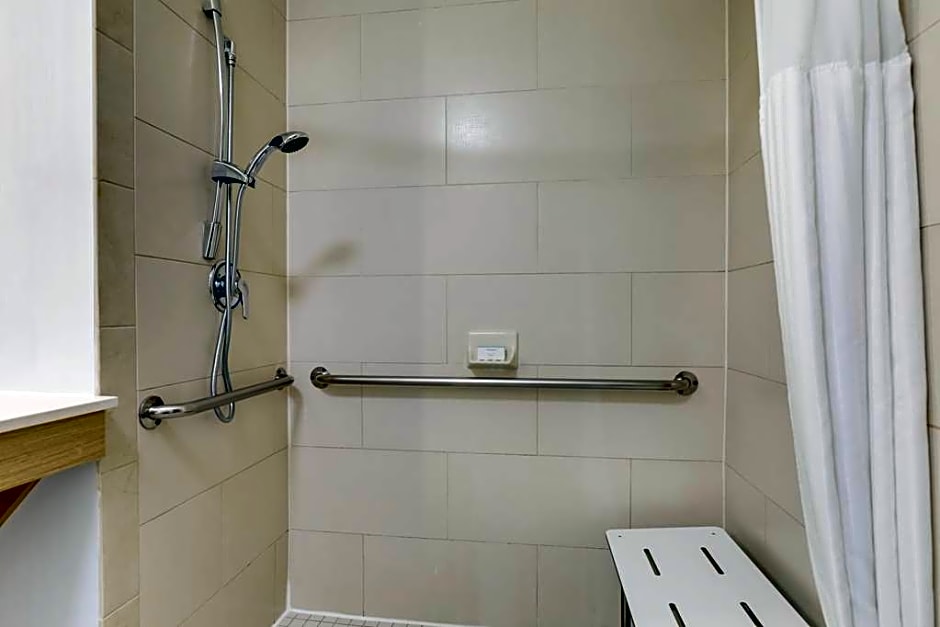 This mobility and hearing accessible room features a king-sized bed with pillow-top mattress, accessible tub, a comfortable chair with ottoman, and a 36-inch HDTV. Be productive in the ergonomic chair, which is good for the back and better for work. Recharge when you want to using the microwave, refrigerator, and coffee/tea maker. Find what you need to get the job done with the special work area's complimentary WiFi, desk with lamp and electrical outlets at desk height, and telephone with dataport and voicemail. Any corresponding photo may not reflect the specific accessible room type or room feature.