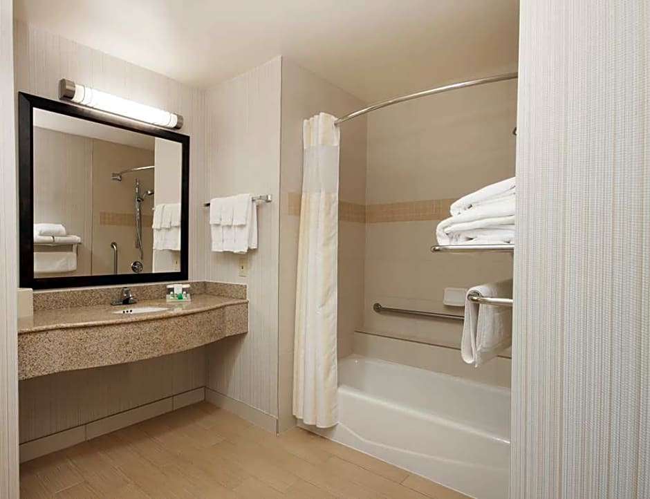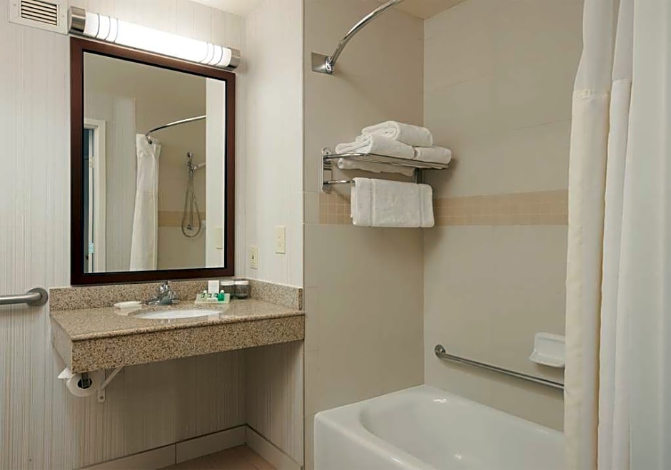This mobility and hearing accessible room features a king-sized bed with pillow-top mattress, accessible tub, a comfortable chair with ottoman, and a 36-inch HDTV. Be productive in the ergonomic chair, which is good for the back and better for work. Recharge when you want to using the microwave, refrigerator, and coffee/tea maker. Find what you need to get the job done with the special work area's complimentary WiFi, desk with lamp and electrical outlets at desk height, and telephone with dataport and voicemail. Any corresponding photo may not reflect the specific accessible room type or room feature.